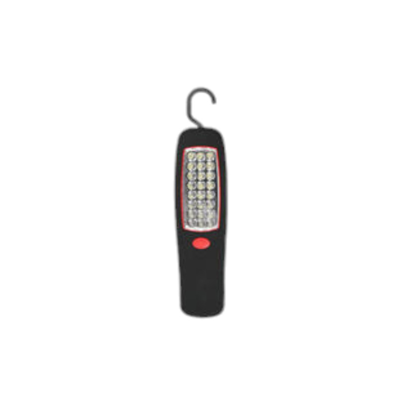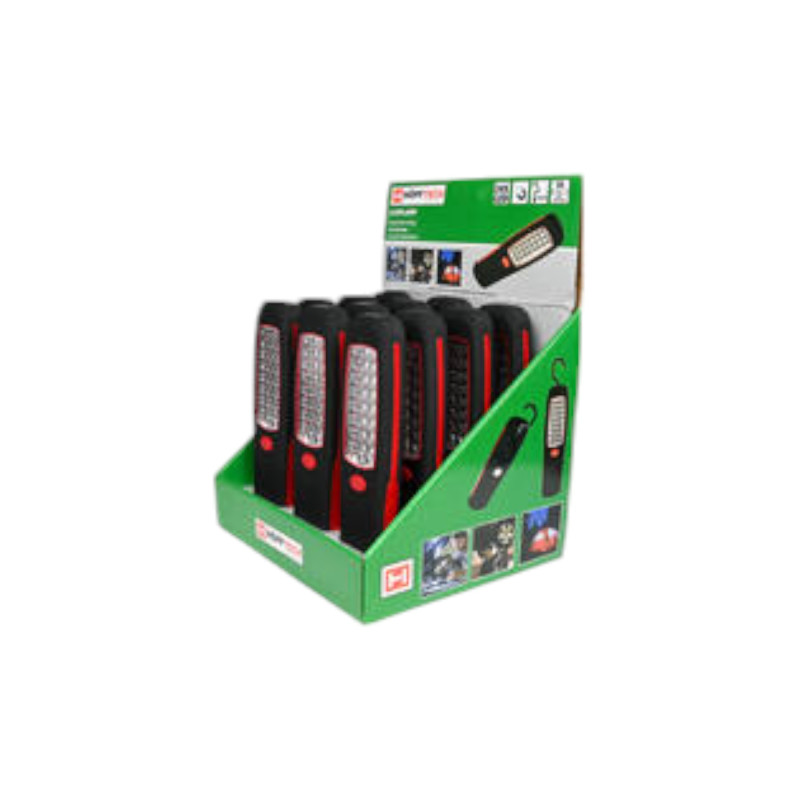 Imán extrafuerte. Gancho para colgar incorporado de 360°. Carcasa de goma resistente la intemperie. Funciona con 3 pilas LR03 (no incluidas). Expositor de 12 uds.