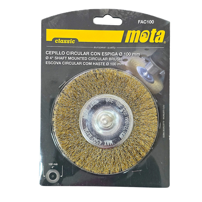 Cepillo circular de alambre fino para taladro. Alambre ondulado de acero templado de 0,3 mm y espiga de 1/4. Ideal para pulir y quitar residuos de pintura. RPM Max: 50 mm: 7.500. 75 mm: 4.500. 100 mm : 4.500.