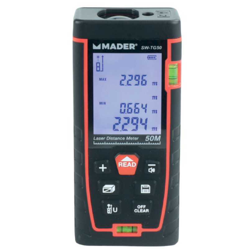 Teorema de pitágoras. Suma y resta medidas. Área de medición: 0,05-50 m. Exactitud de medida en 50 m: ± 2 mm. Láser: c lase 2. Batería: 2 x LR03 (AAA). Protección polvo y agua: IP54. Incluye bolsa de protección + pilas.